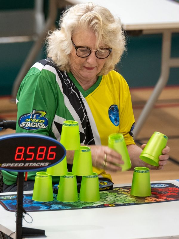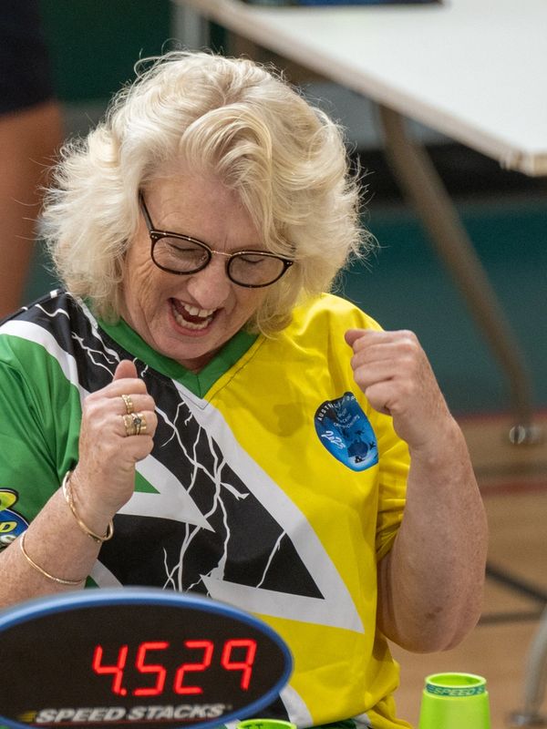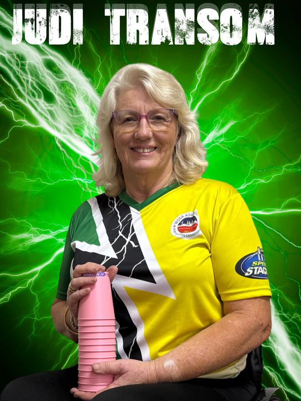 Judi Transom is one of 3 Special Stackers that have earned their way onto the Australian Lightning. Judi started stacking in April 2023 and has been practicing hard ever since. Judi stacks in a wheelchair and even though sitting stacking is a disadvantage, that doesn’t stop Judi from achieving great times including her first 13 second time in tournament for Cycle in 2024. Judi was invited onto the Australian Lightning Team after the 2023 National Sport Stacking Championships 2023.