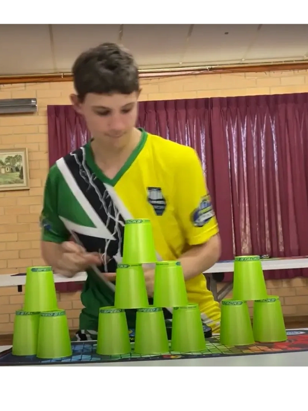 Mitchell Stribley started in March 2023 and came to his first tournament 3 weeks after learning stacking. At his first tournament he achieved a 1st Place in 3-3-3 for his age division, which was a very good accomplishment given how little experience he had with stacking. With intense practice and dedication, Mitch excelled and at the Australian National Sport Stacking Championships 2023 after months of grinding, Mitch was offered a spot on the Australian Lightning Team.